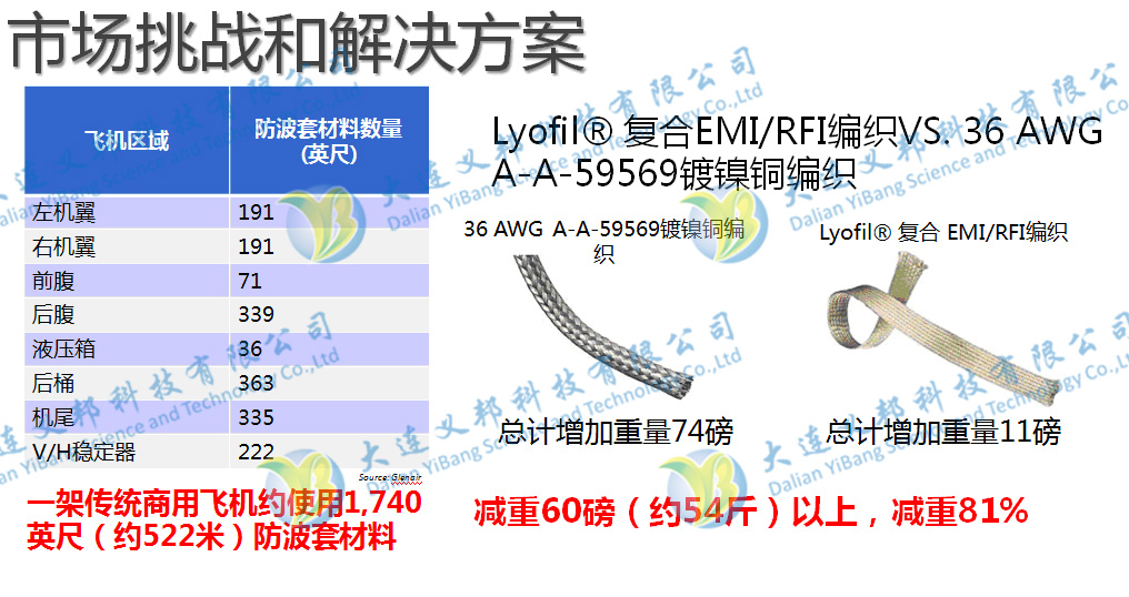 隨著電磁敏感設備在現代飛機上的大量使用,導線的屏蔽效能必須十分優異,大量線纜的屏蔽層和防波套也占據了很大的重量比,采用美國SYSCOM超輕鍍金屬纖維絲作為電纜屏蔽層和編織成防波套可以在提高現有性能基礎上減重80%,與金屬基材料相比不僅可以大幅度減重,而且增強機械性能和耐疲勞性能,更出色的耐高溫耐腐蝕特性,電磁屏蔽效能也十分卓越。