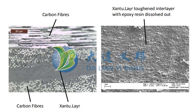 確切的說,Xantu.Layr 不是復合材料中纖維增強的物質,而是作為樹脂的增強劑。例如:代替樹脂中使用的增強顆粒,Xantu.Layr可以作為樹脂韌性增強物質放置于每一層預浸料或者增強纖維之間。