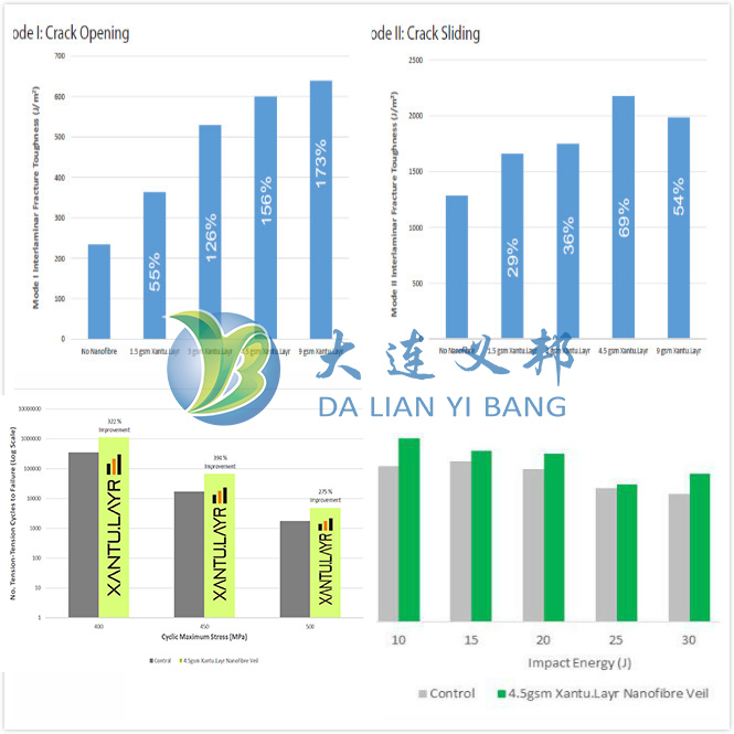 Xantu Layr納米纖維薄膜可以用在碳纖維預浸料層間增韌,用于改善斷裂韌性(抗分層性),沖擊強度之后的壓縮(損傷容限)和復合材料分層的抗疲勞強度。納米纖維膜在層間區域充當脆性樹脂基體的納米級增強物質,最終形成更堅韌的樹脂,在受到壓力或沖擊時不易發生微小裂紋。