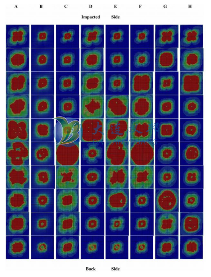 A-H 8款樣板的分層破損區(qū)域見紅色部分