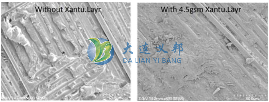 含有和不含有納米纖維膜的實(shí)驗(yàn)樣品的斷口形態(tài)如上圖所示