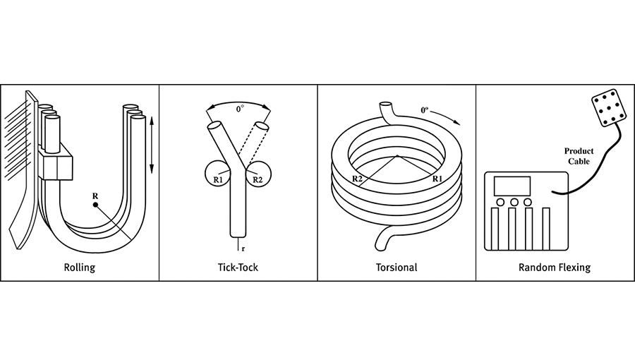 電纜如圖所示的四種基本運動中一種或多種方式彎曲,每一次電纜彎曲時其導(dǎo)體和屏蔽層都會受到壓力。金屬對抗重復(fù)應(yīng)力的抵抗力較差,即使應(yīng)力保持在15%伸長率的屈服點以下,金屬剪切應(yīng)力的抵抗力也非常低,PBO鍍金屬高分子纖維就是為了替代金屬防波套而被研發(fā)。