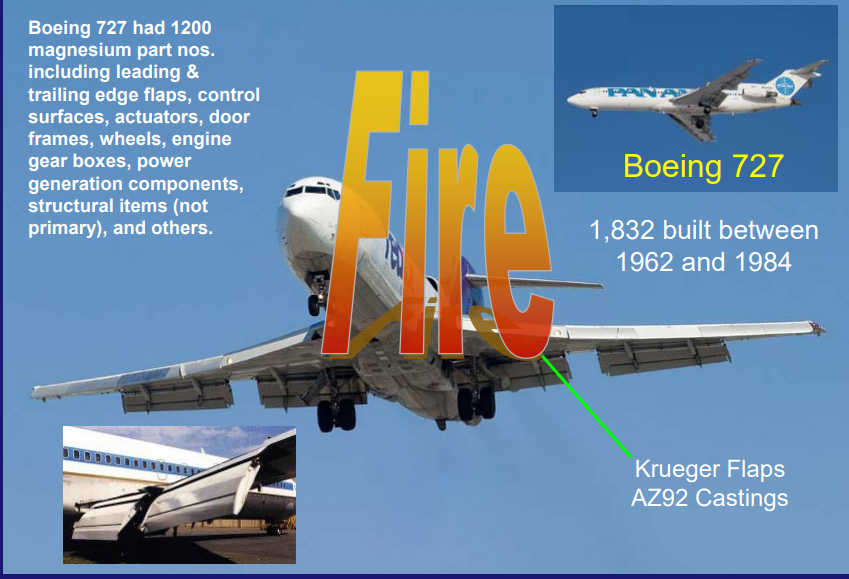波音727有1200個鎂零件。包括前緣和后緣襟翼,控制面,執行器,門框,車輪,發動機齒輪箱,發電部件,以及非主要結構等。