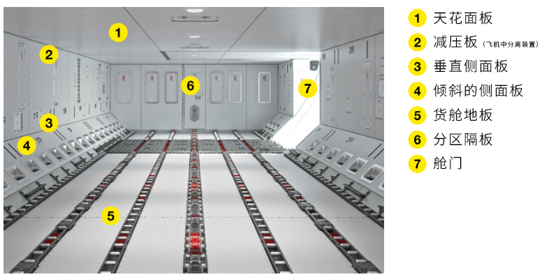 以空客A340-600為例,貨艙內(nèi)部空間約為143立方米(5050立方英尺),封閉如此大的空間需要許多組件: